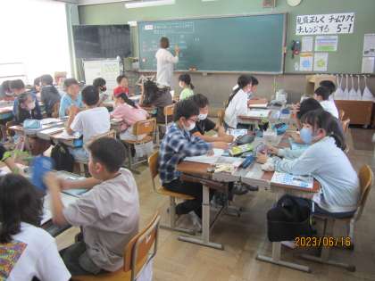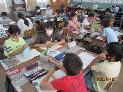 理科「植物の発芽と成長」の学習のまとめをしました。日光にあてるもの、あてないもの、肥料をやるもの、やらないものなど、様々な条件を変えて、2週間かけて成長した植物の様子を観察しました。茎や葉の大きさを定規で測って、どれだけ大きくなったかを実感していました。次の単元である「メダカのたんじょう」も並行して学習しています。メダカが誕生するまでにどんな過程があるのか、楽しく学習してほしいと思います。