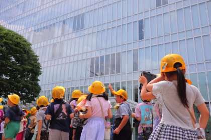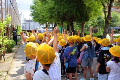 待ちに待った校区探検の日です。子どもたちは朝から校区探検の話で盛り上がっていました。初回の今日は駅方面へ向かいました。「こっち側初めて来た!」「大きなビルがあるね。」といろんな発見をしながら探検をしました。