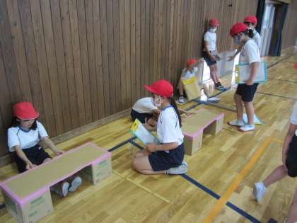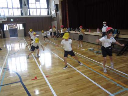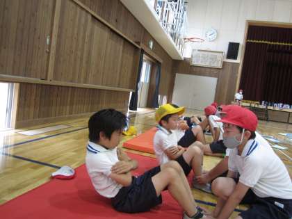 3年生と合同で、新体力テストを行いました。反復横跳び、上体起こし、立ち幅跳び、長座体前屈の4種目を、5年生が3年生にやり方を説明し、記録等、お手伝いをしました。どうやって説明したら伝わりやすいか、同じグループの仲間と話合い、スムーズに進められるよう、工夫していました。「すごい!」「ファイト!」等、ポジティブで、思いやりのあるかけ声が体育館中に響き渡っていました。
