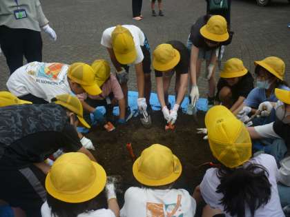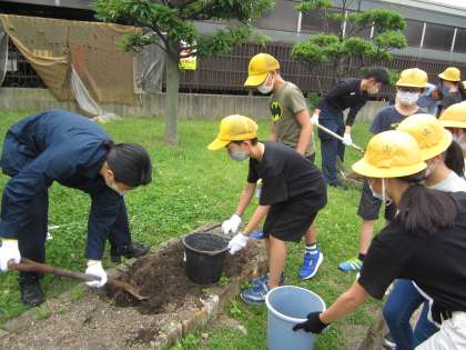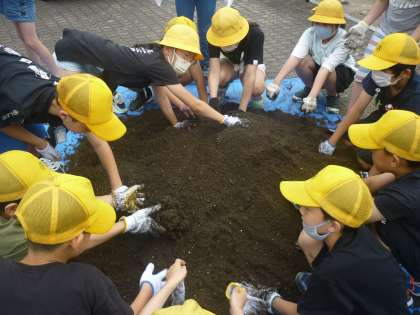 まず、地域の方々が掘り起こしてくださった、花壇の土をブルーシートに運び、腐葉土や肥料、石灰と混ぜ、栄養のある土をみんなでつくりました。手が土だらけになりながらも、一生懸命全身を使ってかき混ぜていました。笑顔がはじけ、とても楽しそうな様子でした。