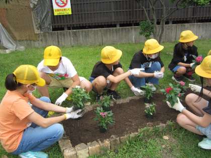 自分たちの手でかき混ぜた、栄養にある土をもう一度花壇へ戻し、土をならしたら、グループのみんなで話し合って考えたデザインを基に、花を植えました。花と花の間隔をこだわり、YOU YOUパークに訪れた人が癒されるような美しいものにしたいと、丁寧に取り組んでいました。