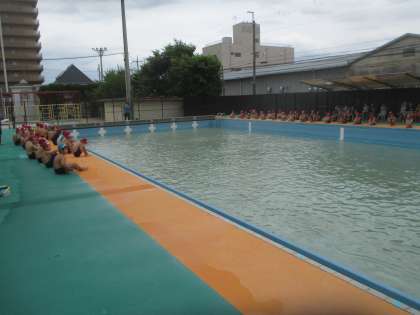 水遊びの学習では、少し水位を深くして学習を進めています。バディで水慣れをし、そのあとは、全体でもぐる・浮く遊びをしています。バディと様子を見あいながら、安全に気を付けて学習を進めています。