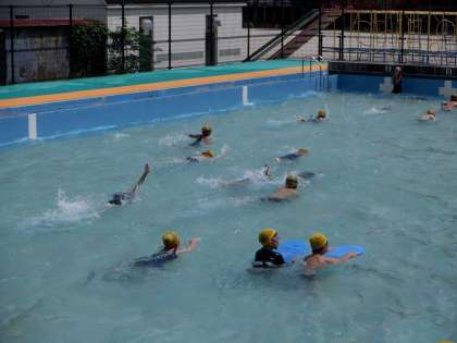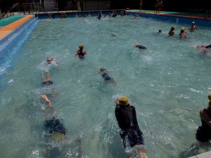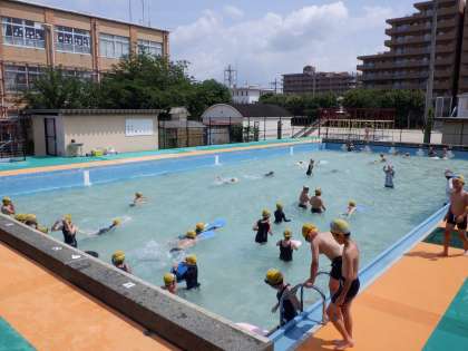 4年生はクロールの練習に取り組んでいます。手のかき方や息継ぎの仕方が少しずつ上達しています。