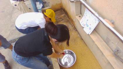 衣服の手入れに関する実習で、ゼッケンの手洗いをしました。洗剤の量による汚れの落ち具合の差や、取扱絵表示についても学び、実生活でも役立てたいという思いを持つ子どもたちもいました。