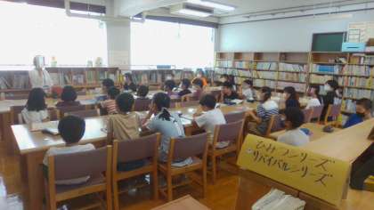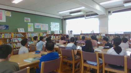 1学期最後の単元です。自分の印象に残っている本を紹介するブックトークを行います。1時間目は図書館司書の先生と連携してブックトークのお手本を見せてもらいました。