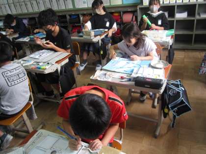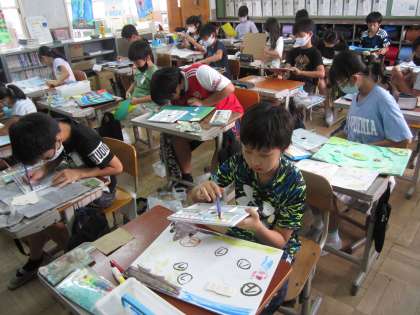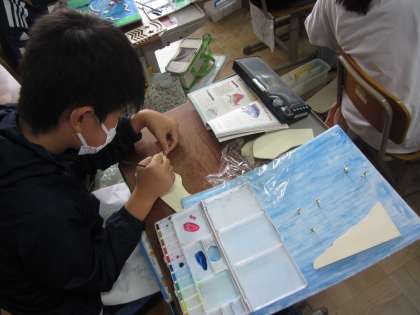 図画工作のわくわくプレイランドは、色塗りや飾り付けをして、世界に一つだけの作品を完成させようと、頑張っています。実際に、ビー玉を転がしてみて、「もっとコースを難しくしたいから、壁をつくってみよう!」と奮闘する様子も見られました。完成まであと少し!最後まで丁寧に仕上げ、納得のいく作品にしてほしいと思います。