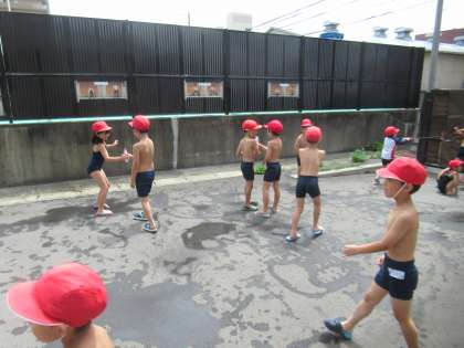 水泳学習の前に、空き容器を使って、水遊びをしました。