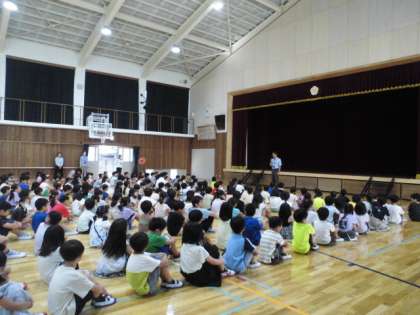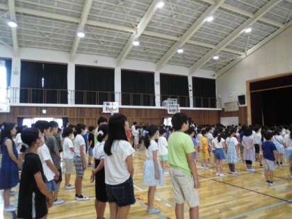 みんなで校歌を歌った後、校長先生から「長い夏休み、目標を決めて過ごしましょう。」とお話がありました。