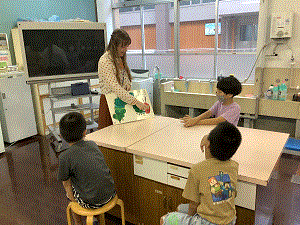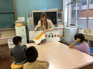 ALTのアン先生と一緒に学習しました。はらぺこあおむしの英語版の読聞かせをしていただきました。あおむしの絵本に果物が出てきたので、絵本の読み聞かせの後にフルーツクイズをしました。