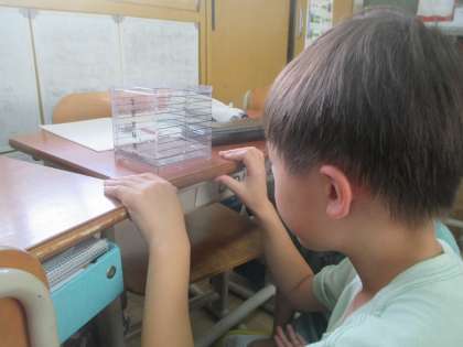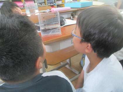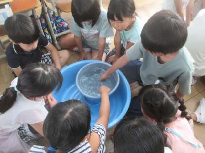 算数では、かさの学習を始めています。実際に水をリットルますに入れ、重さを感じました。リットルは子どもたちにとって、身近なもののようでしたが、リットルの一つ小さい単位を知ると、「え?」と驚いているようでした。