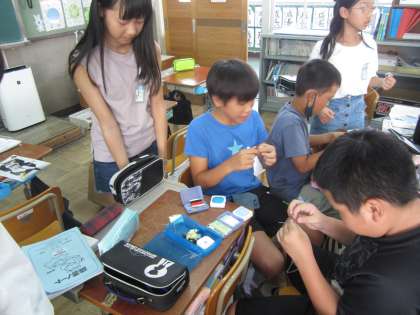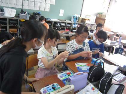 家庭科では手縫いを学習していますが、玉結びや玉止め、様々な縫い方があり、苦戦する子どもたちの姿も見られます。そこで、家庭係のみんなが、休み時間に裁縫レッスンを開き、苦手を克服できるようサポートしていました。自主的に、考えて行動できる子どもたちの姿は、本当に素敵でした。授業では、ボタン付けをしましたが、とても上手にできました。