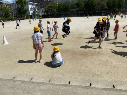 今日から1組2組合同で大繩チャレンジを始めました。制限時間内で南海跳べるか、記録を伸ばそうと燃えています!