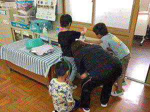 自分たちでシャボン作りをして、そのあと実際にシャボン玉遊びをしました。少し風があり、流されていくシャボン玉を追いかけて楽しみました。