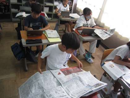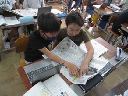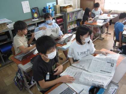 国語の学習では、新聞の構成や工夫について考えています。今日は、実際の新聞を見て、ニュース以外にも、番組表や商品の宣伝があることに気付いたり、読者が興味をもって読めるよう、見出しの表現の仕方に工夫があることを見つけたりしていました。これを機に、新聞への興味をもち、学習に生かせたら良いと思います。