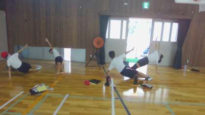 リズムダンス、体ほぐしの学習の中で体操の二人技に挑戦しました。はじめはタイミングや息を合わせることが難しかったですが、少しずつ一体感が出てきました。