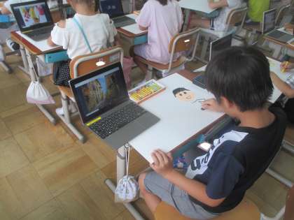 図画工作では、『ことばのかたち』という学習をしています。読み聞かせをした本からイメージをふくらませて、思い思いの絵に表現していきました。