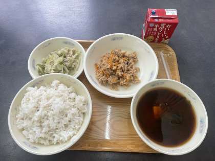 今日の献立は、麦ごはん、牛乳、おからツナ丼(具)、鶏肉とピーマンのごまいため、赤だしです。