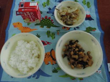 今日の献立は、胚芽米ご飯・牛乳・肉味噌炒め・ごま酢煮です。