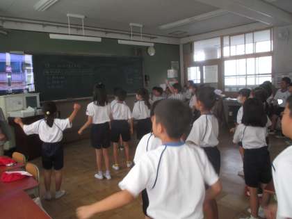 今日の朝、あいにくの雨が降ってしまったので、体育は教室でリズムあそびをしました。今年の体育発表会で披露するダンスの練習に取り組んでいます。