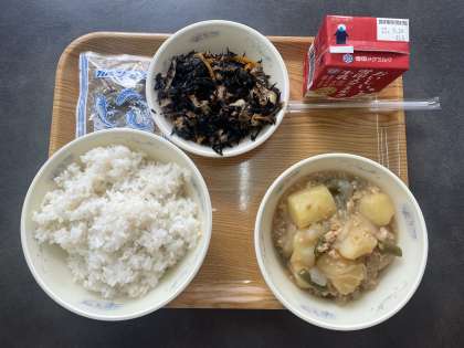 今日の献立は、麦ごはん、牛乳、じゃがいものそぼろ煮、ひじきの煮つけ、じゃこです。