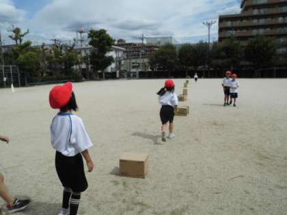 箱を跳び越える「箱とび」や縄跳びを使った「川とび遊び」等、2人組でいろいろなとび遊びに挑戦しました。