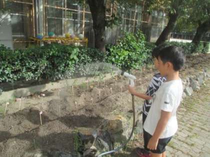 火曜日に種をまいたカブですが、水やり当番を決めてお世話をしています。今朝、様子を見に行くと、小さな芽が出ていました!!子どもたちは大喜びです。