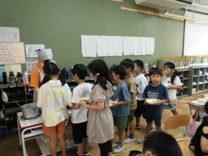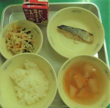 今日の献立は、ご飯・牛乳・鮭の塩麹焼き・小松菜と切干大根の煮浸し・冬瓜のくず引きです。