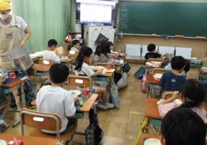 鮭の塩麹焼きは、給食室でスチームコンベクションオーブンで皮がパリッとなるように焼いています。