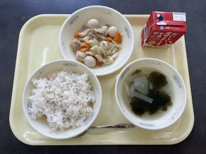 今日の献立は、麦ごはん、牛乳、うずら卵とキャベツのいため煮、わかめスープです。
