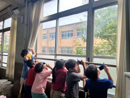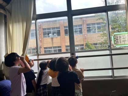 今日は理科の学習で、遮光板を使って太陽の位置を確認しました。