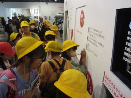 体験を終え、カップヌードルの発明者、安藤百福さんにまつわる歴史や、チキンラーメン誕生までの軌跡、世界のインスタントラーメンの展示に、興味津々な様子でした。いただいたパンフレットのクイズラリーをしたり、昔と今のインスタントラーメンの違いを見つけたりしていました。