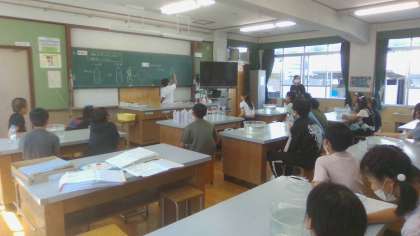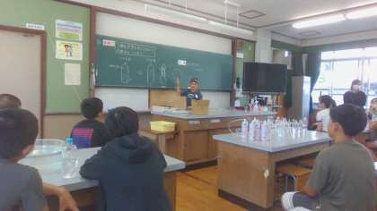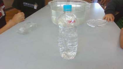 水を入れたペットボトルに二酸化炭素を充満させて振ると、、、なんと!ペットボトルがへこみました!この原理をみんなで考え、説明することで楽しく学習できました。
