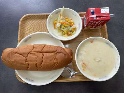 今日の献立は、黒糖コッペパン、牛乳、じゃがいものクリームシチュー、野菜のソテーです。