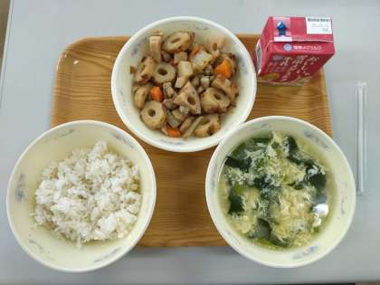 今日の献立は、麦ごはん、牛乳、筑前煮、かきたま汁です。