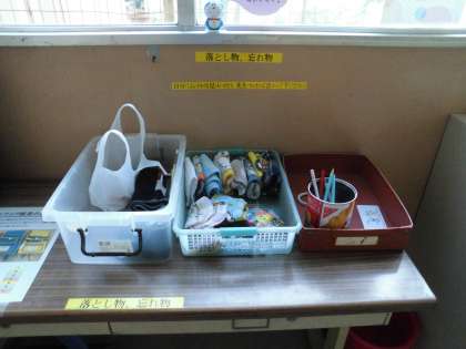 職員室の前に落とし物コーナーがありますので、心当たりのある人は一度さがしてみてください。