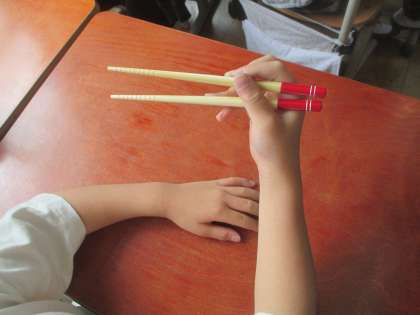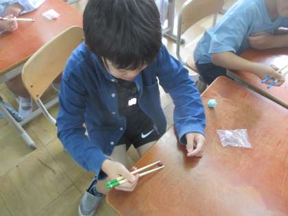 そのあとは、一人一人に写真1枚目のセットを配ってくださり、うまくお箸を動かせるかの練習をしました。お箸の持ち方名人になると、スポンジをギューッとつまむことができました。「え、ギューッとできひん!」という子もいました。最後には、小豆をつまむ練習もしました。つるつるすべる小豆に悪戦苦闘する子どもたち・・・。このセットはプレゼントしてもらったので、本日持ち帰っています。お家でも、お箸の持ち方名人を目指して特訓してみてください!!