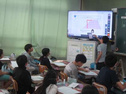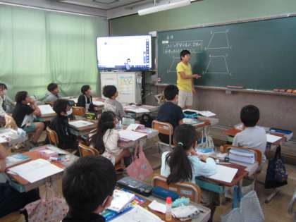 算数では、三角形や平行四辺形、台形、ひし形等の面積の求め方について考えています。自分たちが考えた面積の求め方を交流・発表し、多角的な視点で考えることができた時間となりました。発表している子に、視線を向け、一生懸命聞こうとする子どもたちの姿も見られました。