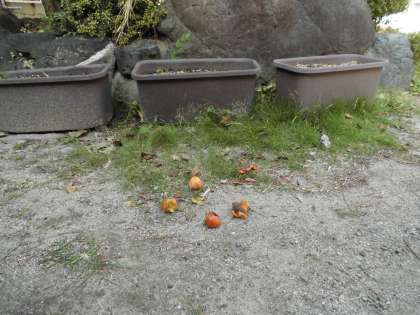 それから、とおり道にかきの実が落ちていることもあり、ふみつけたりすると、足をすべらせてしまうかもしれません。近くを歩くときはじゅうぶんに気をつけましょう。