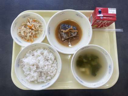 今日の献立は、麦ごはん、牛乳、さばのしょうが煮、切干大根の煮つけ、すまし汁です。
