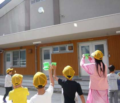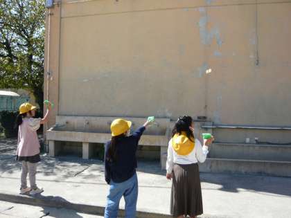 太陽の光を鏡ではねかえして、壁に向かって的当てをしました。