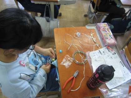図画工作では、「立ち上がれ!ワイヤーアート」の学習をしています。ワイヤーを曲げたり伸ばしたりして思い思いの作品を作っています。ペンチも扱っているので安全に使えるよう、使い方を確認しています。自分たちの納得のいく作品を作ってほしいです。