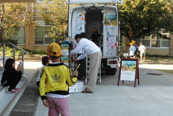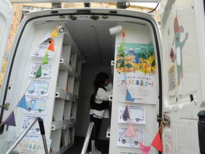今日は、日本新薬の移動図書館「キラキラ未来ゴー」の開館日でした。