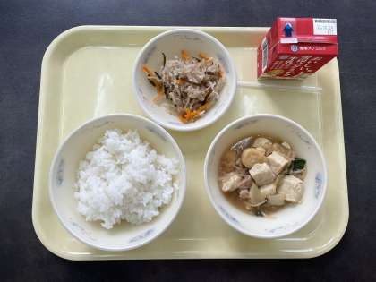 今日の献立は、ごはん、牛乳、かしわのすき焼き、切干大根の三杯酢です。