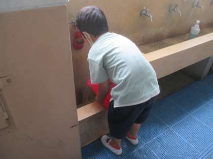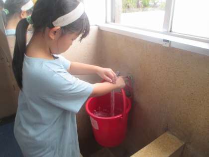 そして、毎週金曜日には、防火バケツの水換えをしています。大人が声をかける前に、自分たちから動くことができるようになってきました。もしもに備えて、みんなで日頃から備えています。
