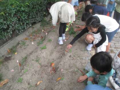 抜いたカブを見て、「小さい大根みたい。」とつぶやく子もいたので、これからカブのどの部分が成長していくのかを話しました。これからも成長を見守っていきます。