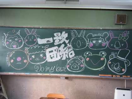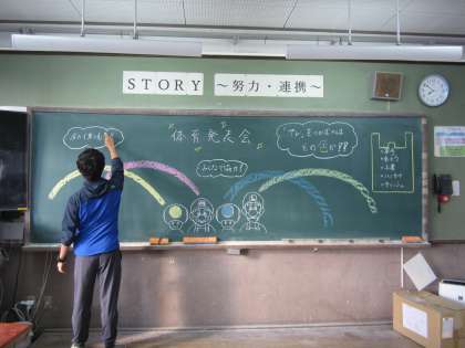 久しぶりの全校での体育発表会。緊張する子どもたちの背中を押したいという気持ちを黒板に表現しました。とても喜んでくれました。