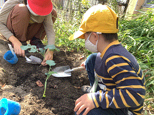 サツマイモを収穫した畑を耕し、その場所に次はブロッコリーを育てます。苗をていねいにポットから出し、土に移し替えました。生長が楽しみです。