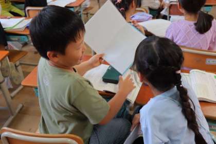 1つの漢字でも、読み方は1つとは限らないことを学習した漢字の読み方博士たちは、漢字の読み方クイズをしました。今までに学習した漢字を使って文を書き、それをペアで読み合いをしました。これからもたくさんの漢字を学習していきます。漢字を正しく読むことができるように頑張っていきます!