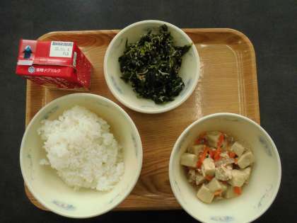 今日の献立は、ごはん、牛乳、高野どうふのそぼろ煮、ほうれん草とじゃこのいためものです。