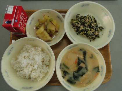 今日の献立は麦ごはん、牛乳、とりとだいこん葉のまぜごはん(具)、さつまいもの栂尾煮(とがのおに)、豆乳のみそ汁です。